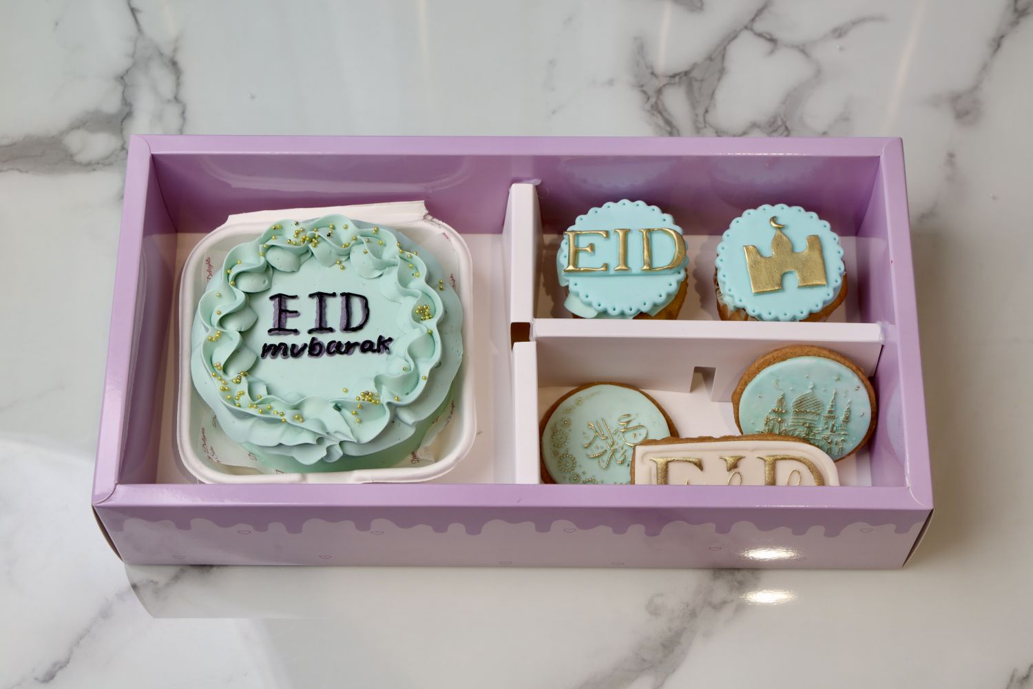 - Includes 1 Bento Cake, 2 Cupcakes, and 3 Eid themed cookies